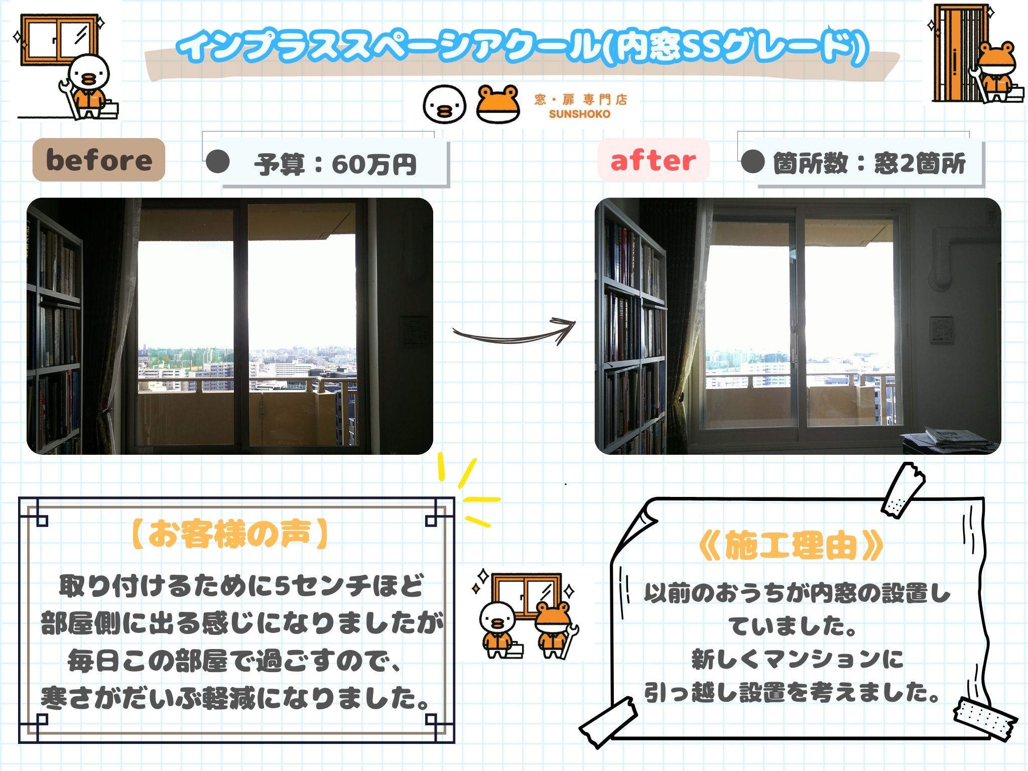 今回の施工事例は吹田市にお住まいの方で、以前のお家で内窓を設置していたかたで、