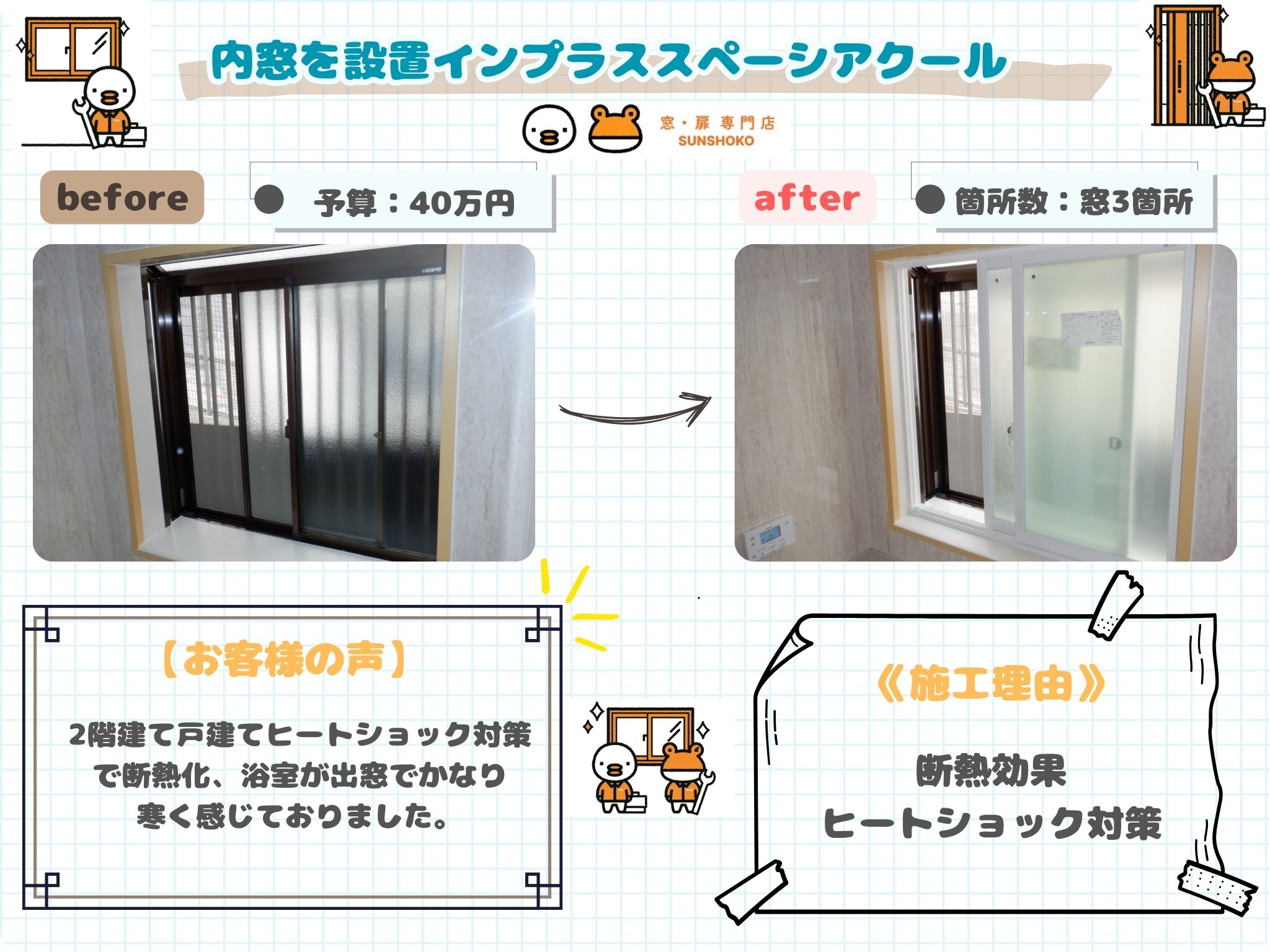 こんにちは☺今回の施工事例はインプラススペーシアクール工事です✨ 和泉市にお住まいの方で、ヒートショック対策・結露対策のために交換して頂きましたよ👧✨